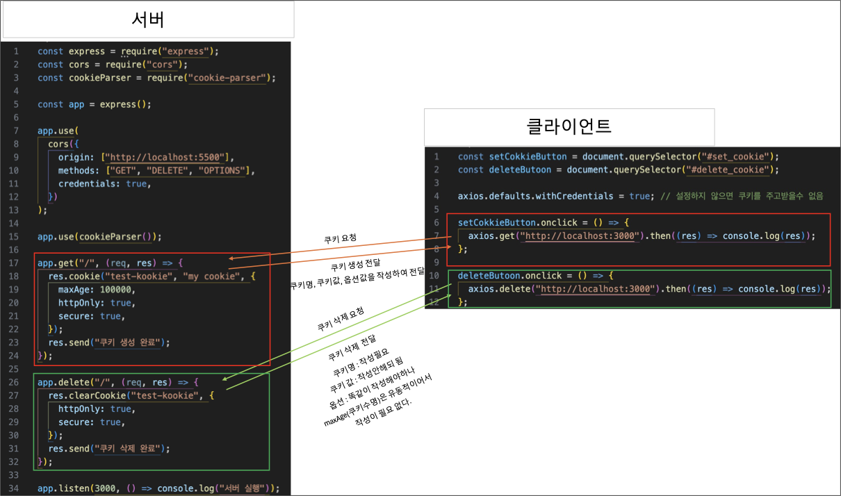 삭제 시 서버측에서 clearCookie 라는 명령어로 삭제가 가능하다. (maxAge 넣지 않아도 상관 없다)