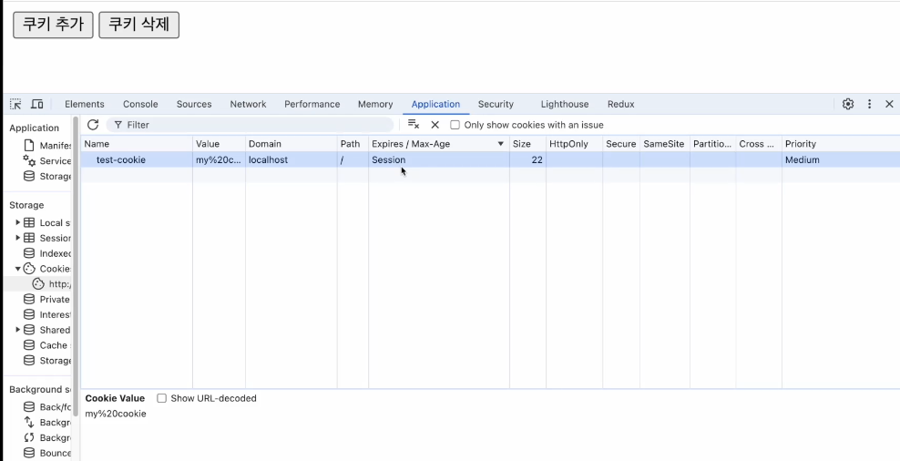 크롬 개발자도구 application에서 확인해보면 쿠기 획득 시 httpOnly 에 체크 표시가 된다.