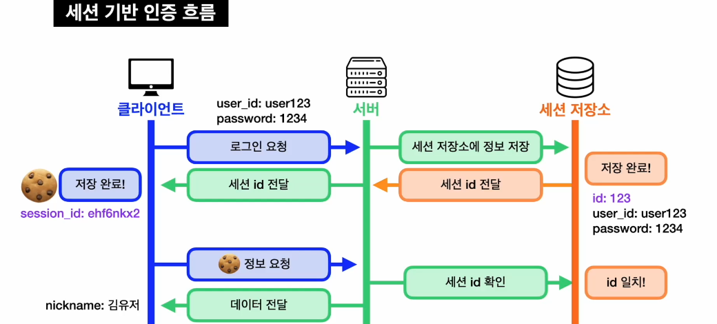 로그인 요청 --> 세션저장소에 정보저장 --> 저장완료 --> 세션 ID 전달 --> 정보요청 --> 세션ID 확인 --> 유저 데이터전달