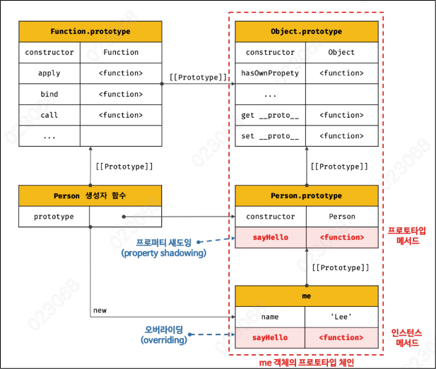 이 결과의 의미는 만약 객체가 메서드를 호출 하게 된다면 자신의 프로퍼티를 먼저 검색하고 없으면, 상위 프로토타입의 메서드를