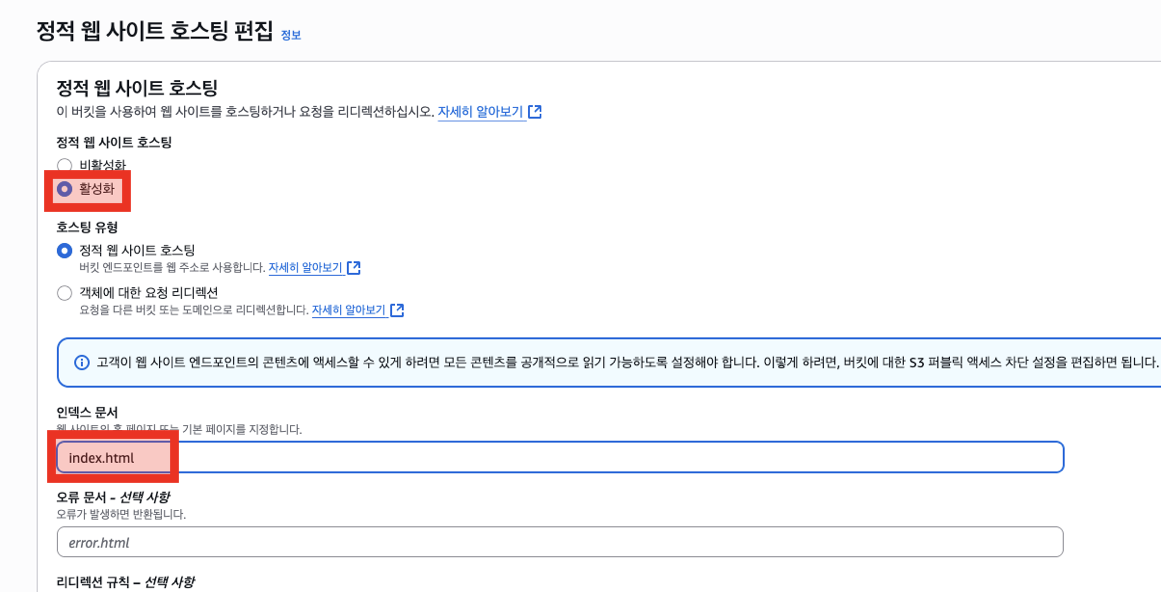 5) 제일 아래 부분으로 가면 정적 웹 사이트 호스팅의 편집을 클릭