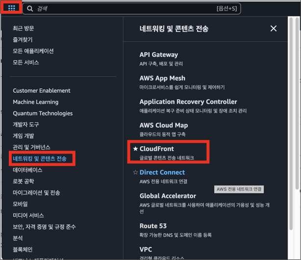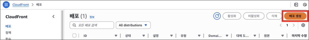 1. 메뉴 > 네트워킹 및 콘텐츠 전송 > CloudFront 를 클릭해서 들어간다.
