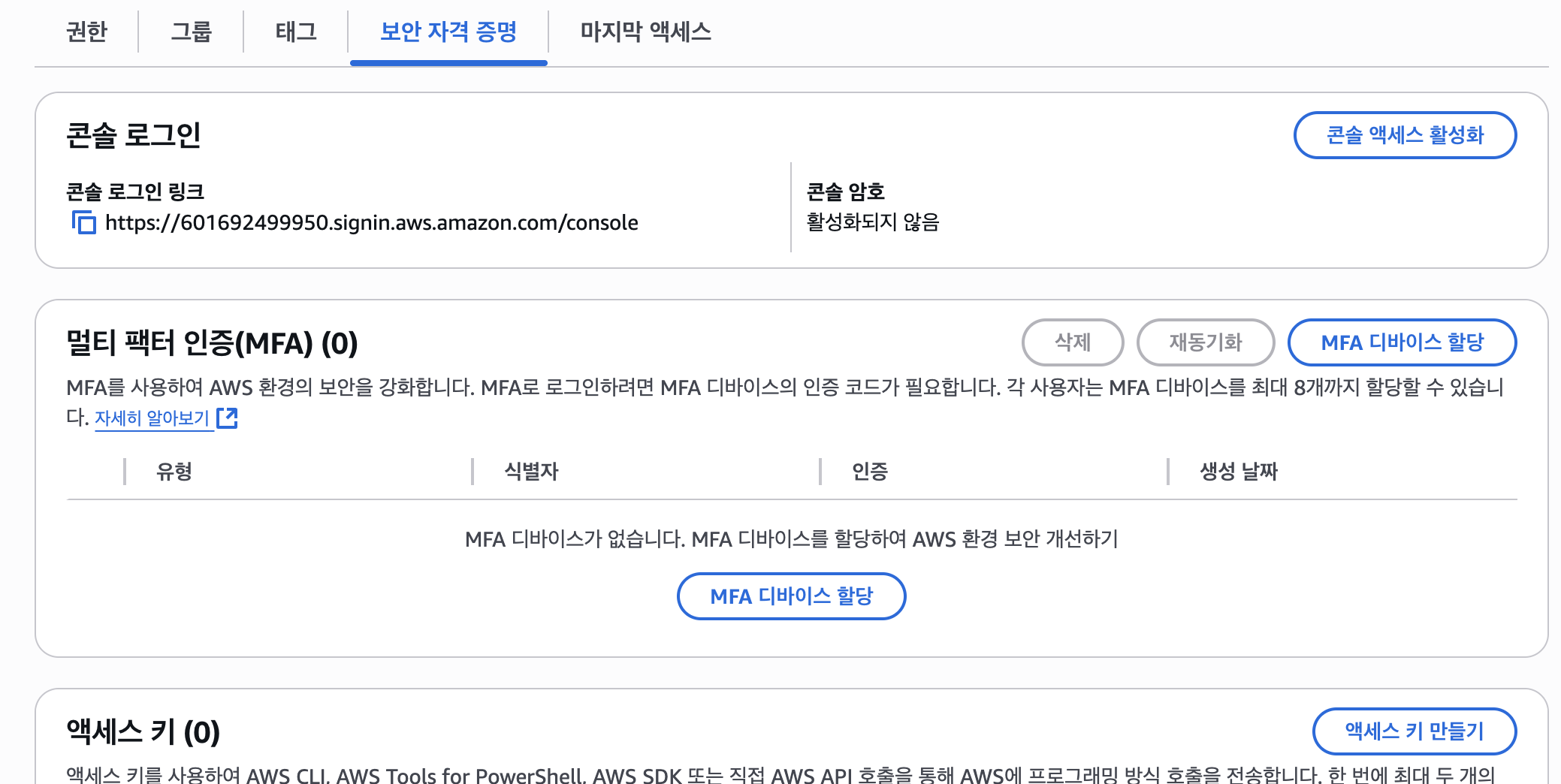 7) 만들어진 사용자로 들어가면 보안자격증명탭에 엑세스 키 만들기를 클릭한다.