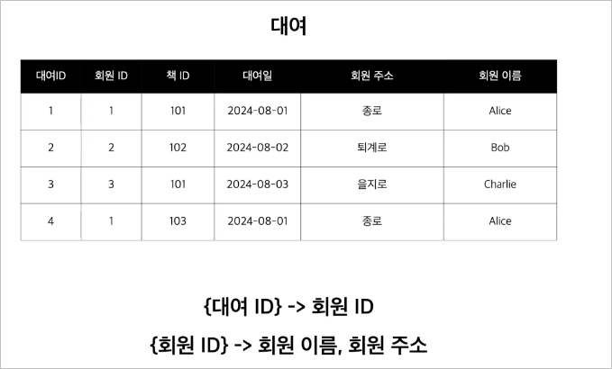 회원의 이름이나 대여한 책의 제목이 변경이 된다면 테이블 내 동일한 이름과 책이름 모두 변경 하여야 한다.