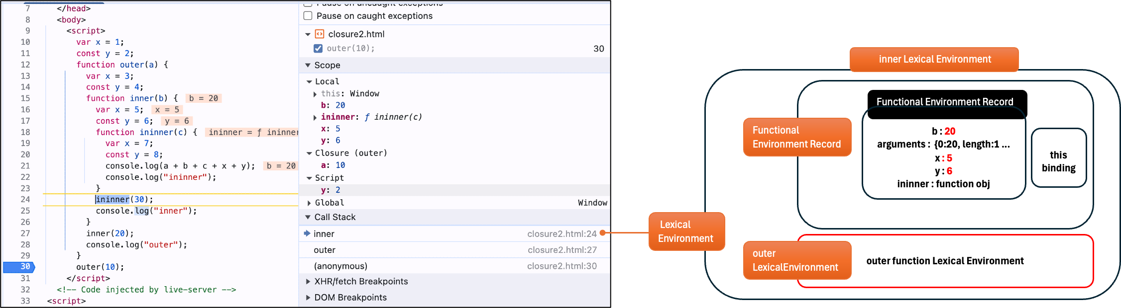 실행 컨텍스트 스텍에서 inner 함수 실행 컨텍스트가 제거 되고 outer 실행 컨텍스트가 실행 중인 실행 컨텍스트가 된다.